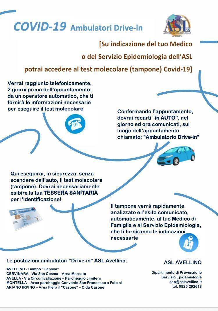 L’Azienda Sanitaria Locale comunica che, nell’ambito delle attività di screening sul territorio provinciale, sono attivate 5 postazione drive-in. I comuni interessati sono Avella, Avellino, Ariano Irpino, Cervinara, Montella, per la somministrazione dei tamponi ai contatti stretti di casi positivi al Covid 19.